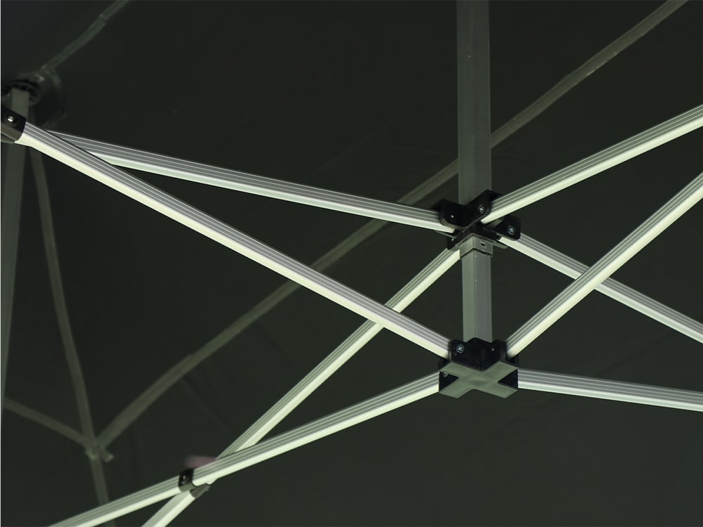 Het dakzeil en de zijwanden zijn gemaakt van hoogwaardig polyester (300 gr/m²), volledig waterdicht en UV-bestendig. Zo blijft u beschermd tegen regen én zon.