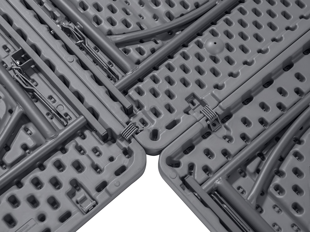 De tafels zijn UV- en waterbestendig, waardoor ze probleemloos zowel binnen als buiten gebruikt kunnen worden. Een automatisch vergrendelsysteem voorkomt ongewenst inklappen. Voor eenvoudig transport en opslag kunt u een transportkar gebruiken waarop tot wel 14 Ć 15 tafels passen.